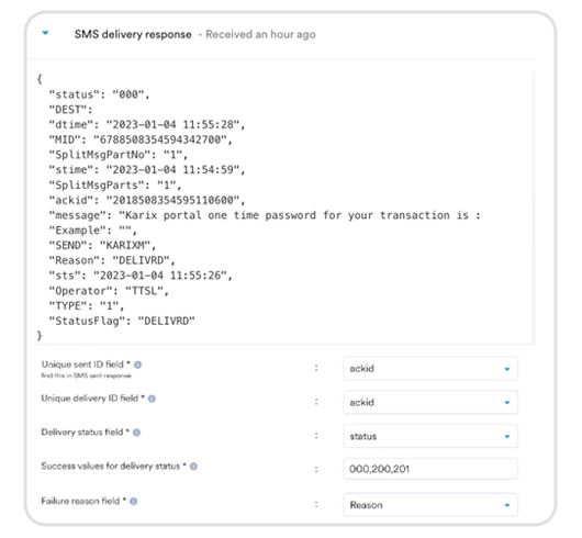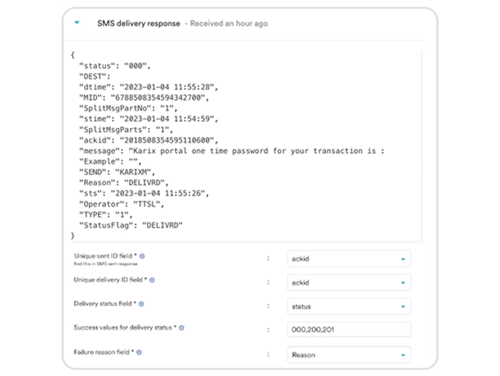 - You can map the fields from this response. The dropdowns are auto-populated with the field names parsed from the delivery response. The first image shows a sample SMS delivery response, and the image below shows the auto-population of the dropdowns from this response for mapping on the Dashboard.