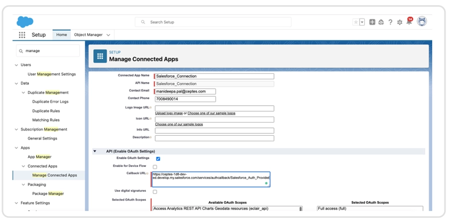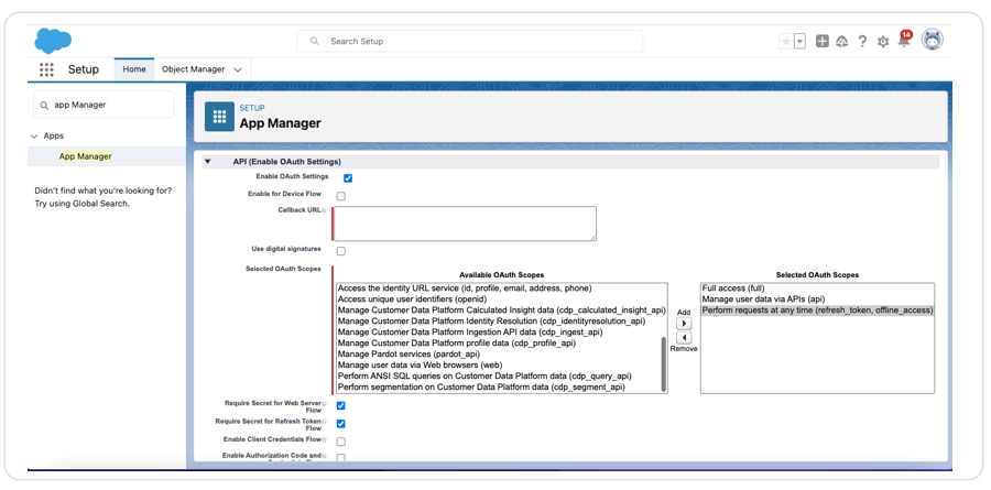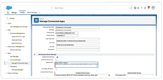 Step 2- Enable OAuth Settings and provide a dummy callback URL. Add scopes for Full access (full), Manage user data via APIs (api), Perform requests at any time (refresh_token, offline_access)