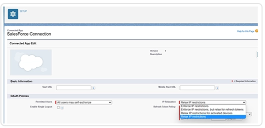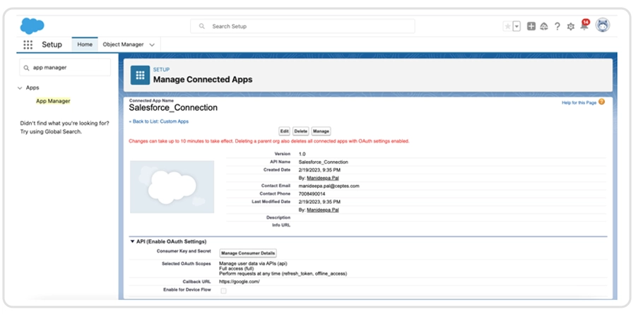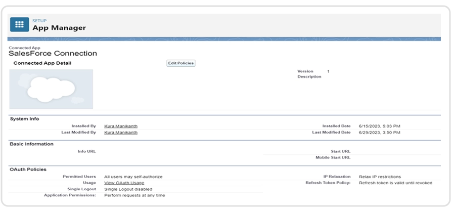 Step 7-Click on Manage on the created connected app. Click on Edit policies.