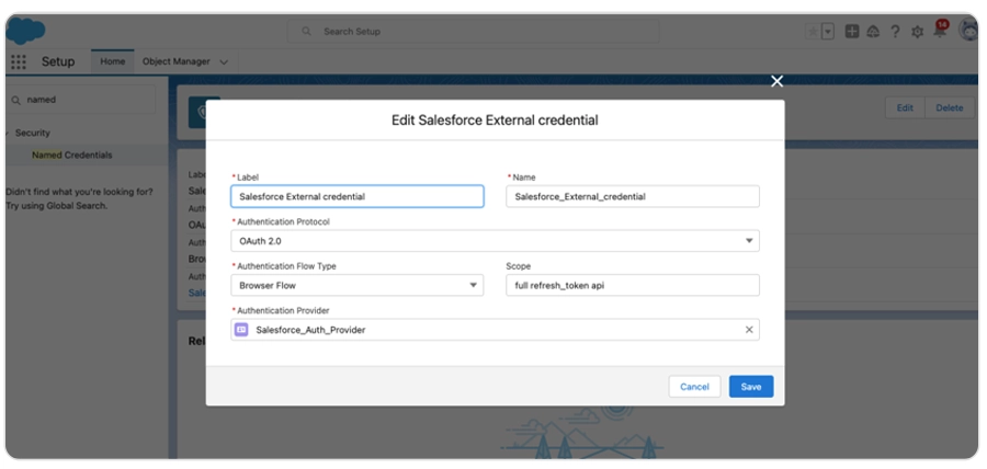 Step10- Create new External Credential using Auth Provider created above, set scope as full refresh_token api and click on Save.
