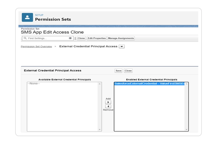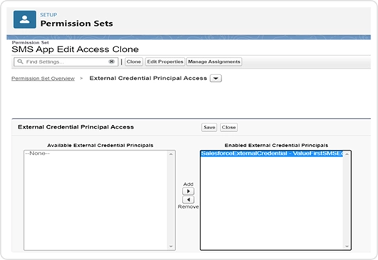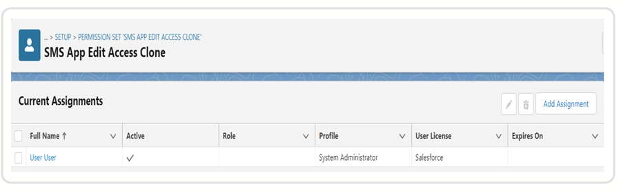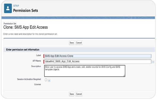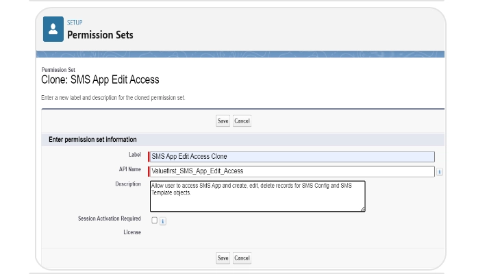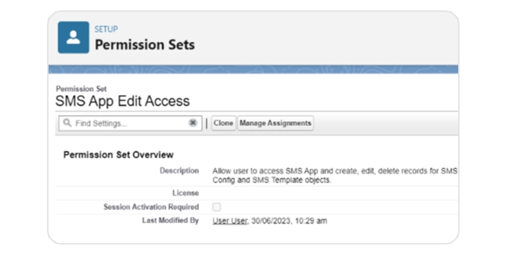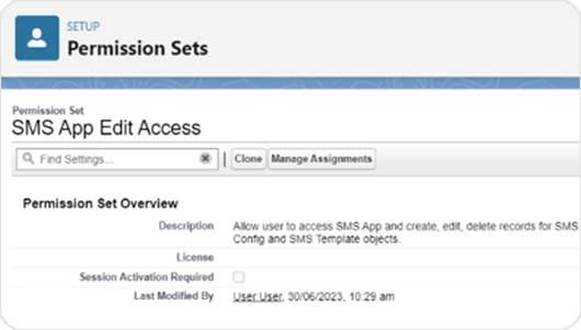 Step 12 – Navigate to Home->Permission Sets->SMS App Edit Access. Click on Clone to clone the Permission Set.
