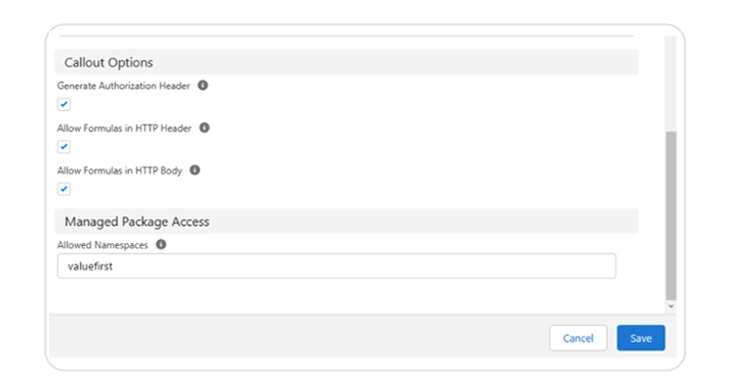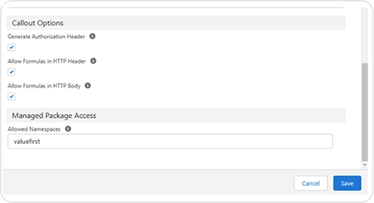 Step 20- Select the checkbox for callout options and add valuefirst namespace in Named Credential