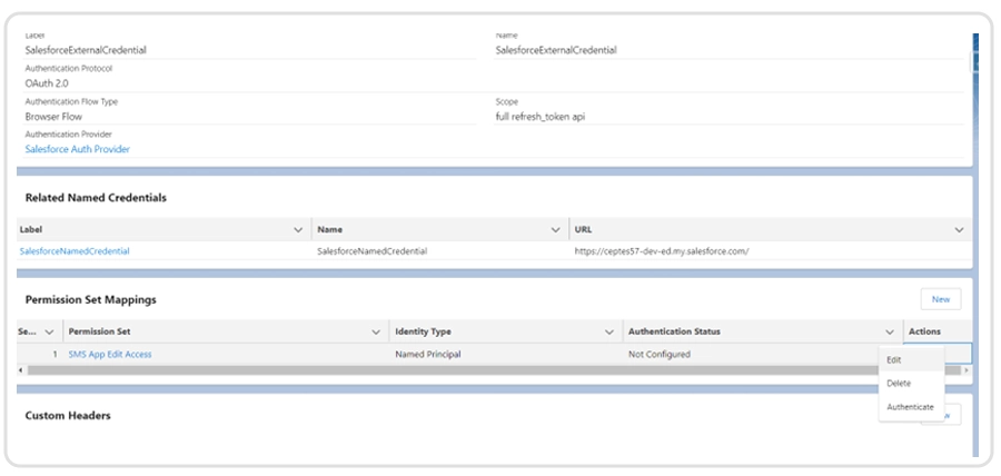 Step 21- Authenticate the External Credential permission set. Once authenticated, the status will change from Not Configured to Configured.