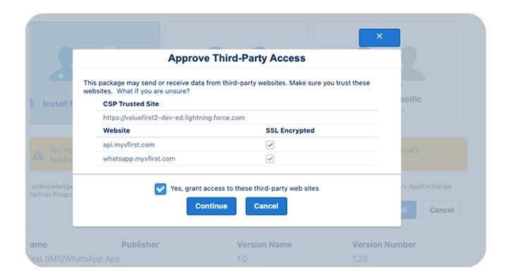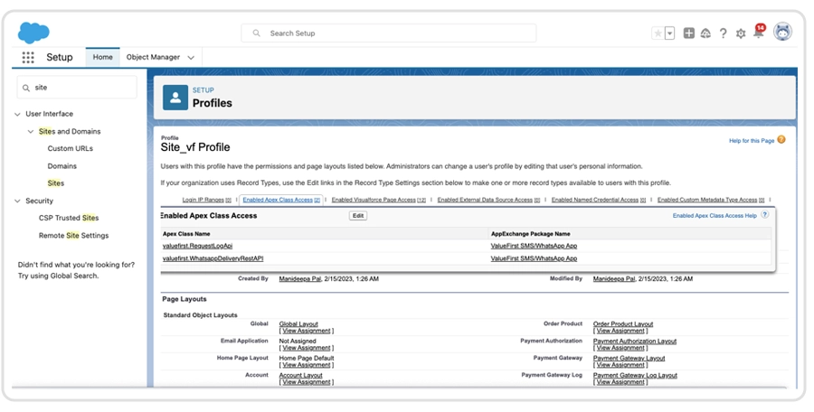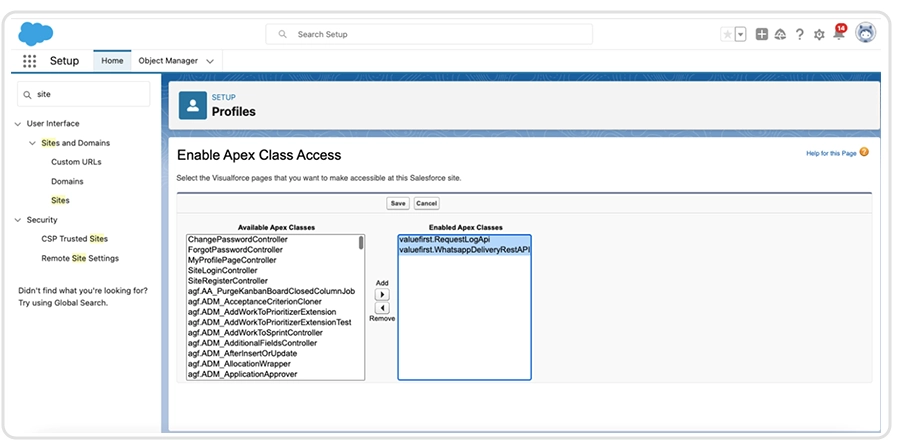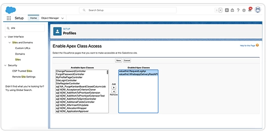 Step 14- Select valuefirst.RequestLogApi and valuefirst.WhatsappDeliveryRestAPI from Available Apex Classes to Enable Apex Classes.