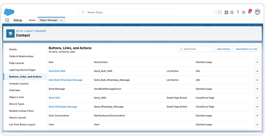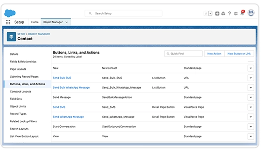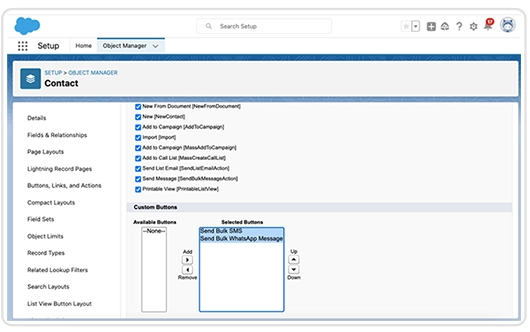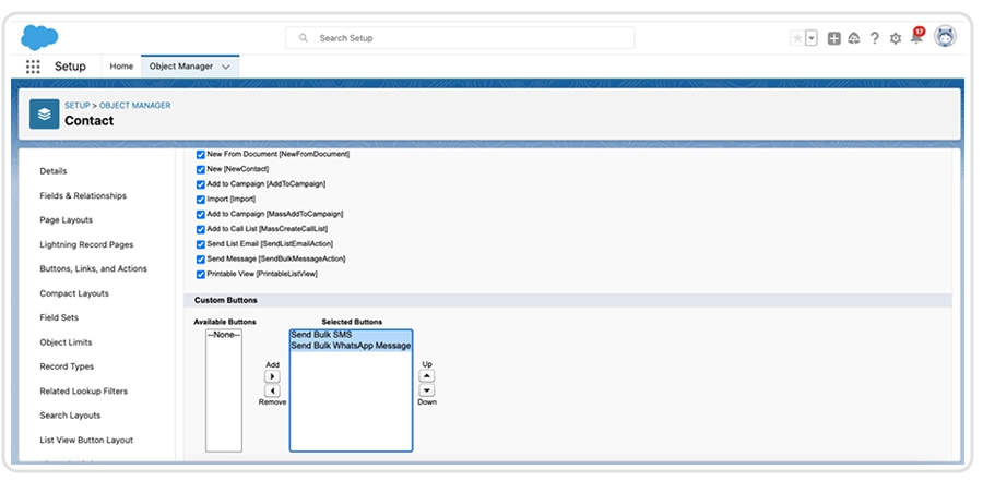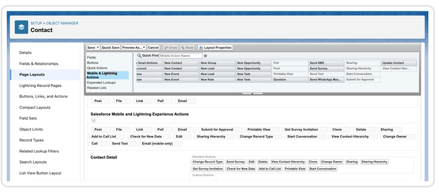 Step 23- Select Contact Layout and go to the Mobile and Lightning Actions and drag Send SMS and Send WhatsApp Messages onto Salesforce Mobile and Lightning Experience Actions.