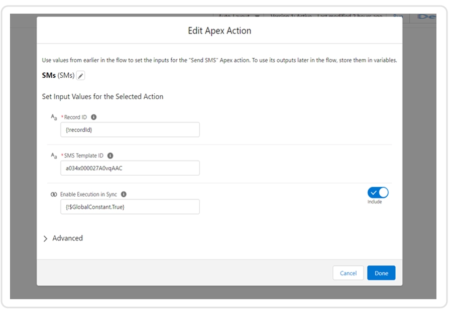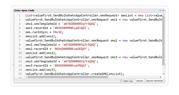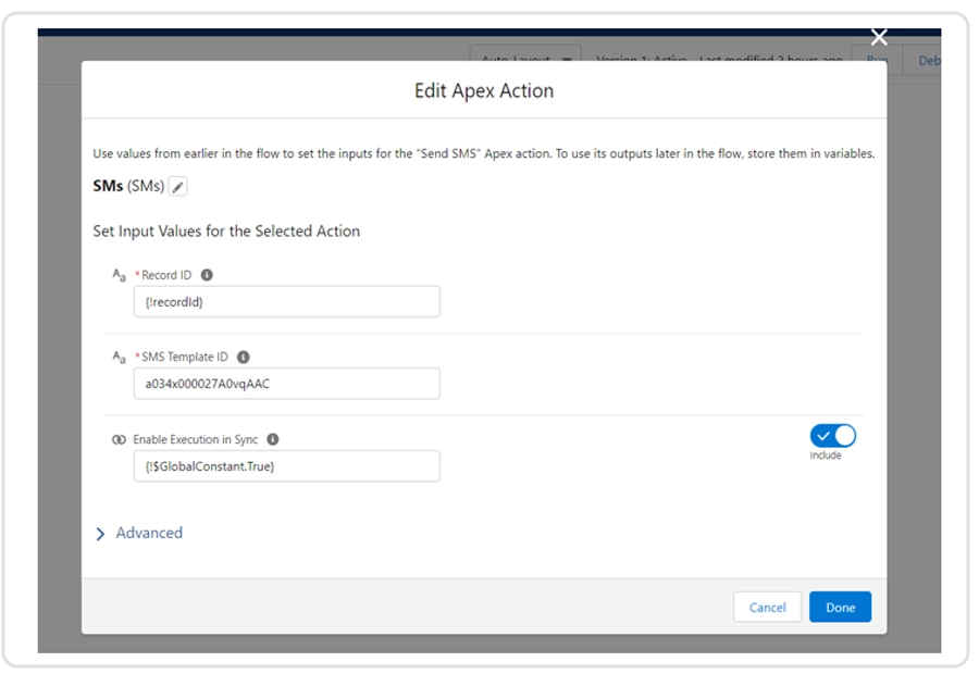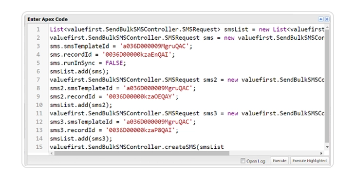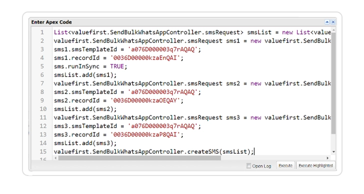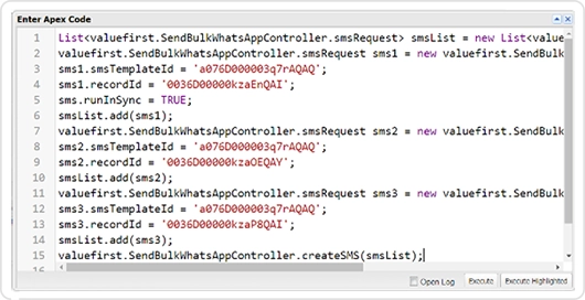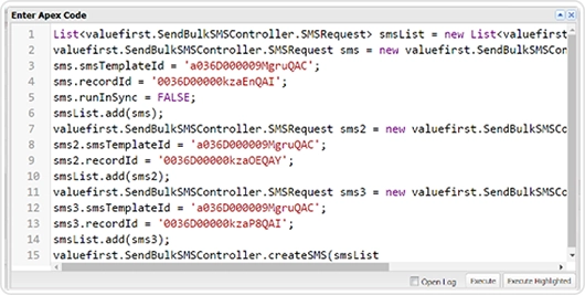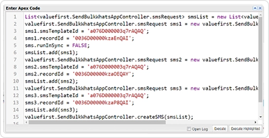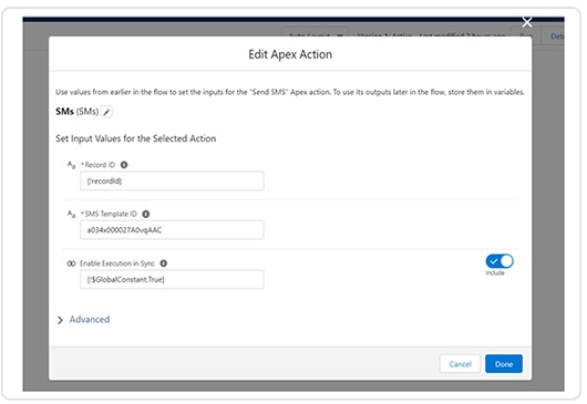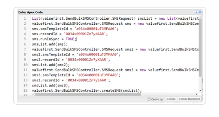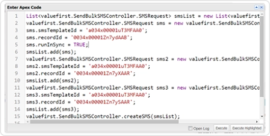 - Enter piece of code and provide sms.smsTemplateId and sms.recordId
