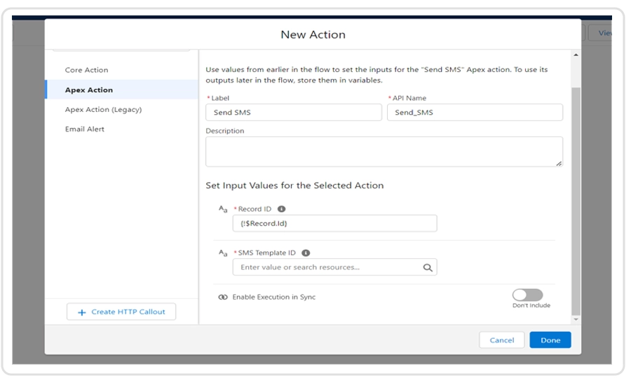 - Click on + and select Action >> Filter By Type >> Apex Action >> Send SMS