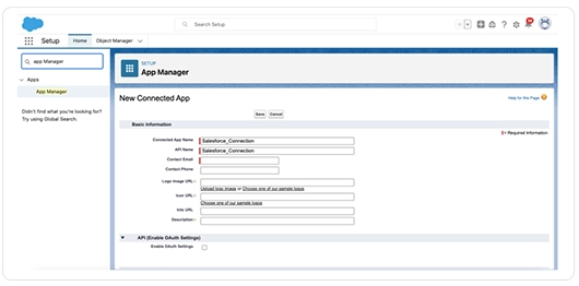 Step 1- Create Connected App: Setup -> App Manager -> New Connected App