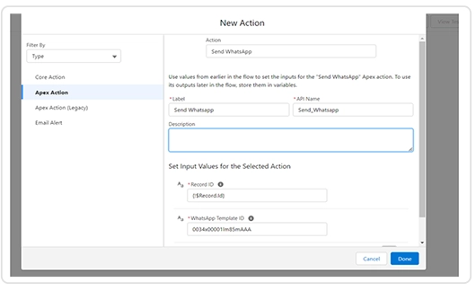 - Click on + and select Action >> Filter By Type >> Apex Action >> Send WhatsApp