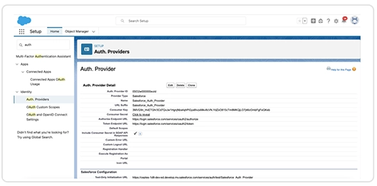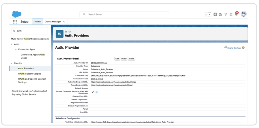 Step 5- Create Auth. Provider: Setup -> Auth Provider -> New. Select Provider type as Salesforce. Provide Client ID, Client Secret copied from Connected App as Consumer Key and Consumer Secret respectively and save.